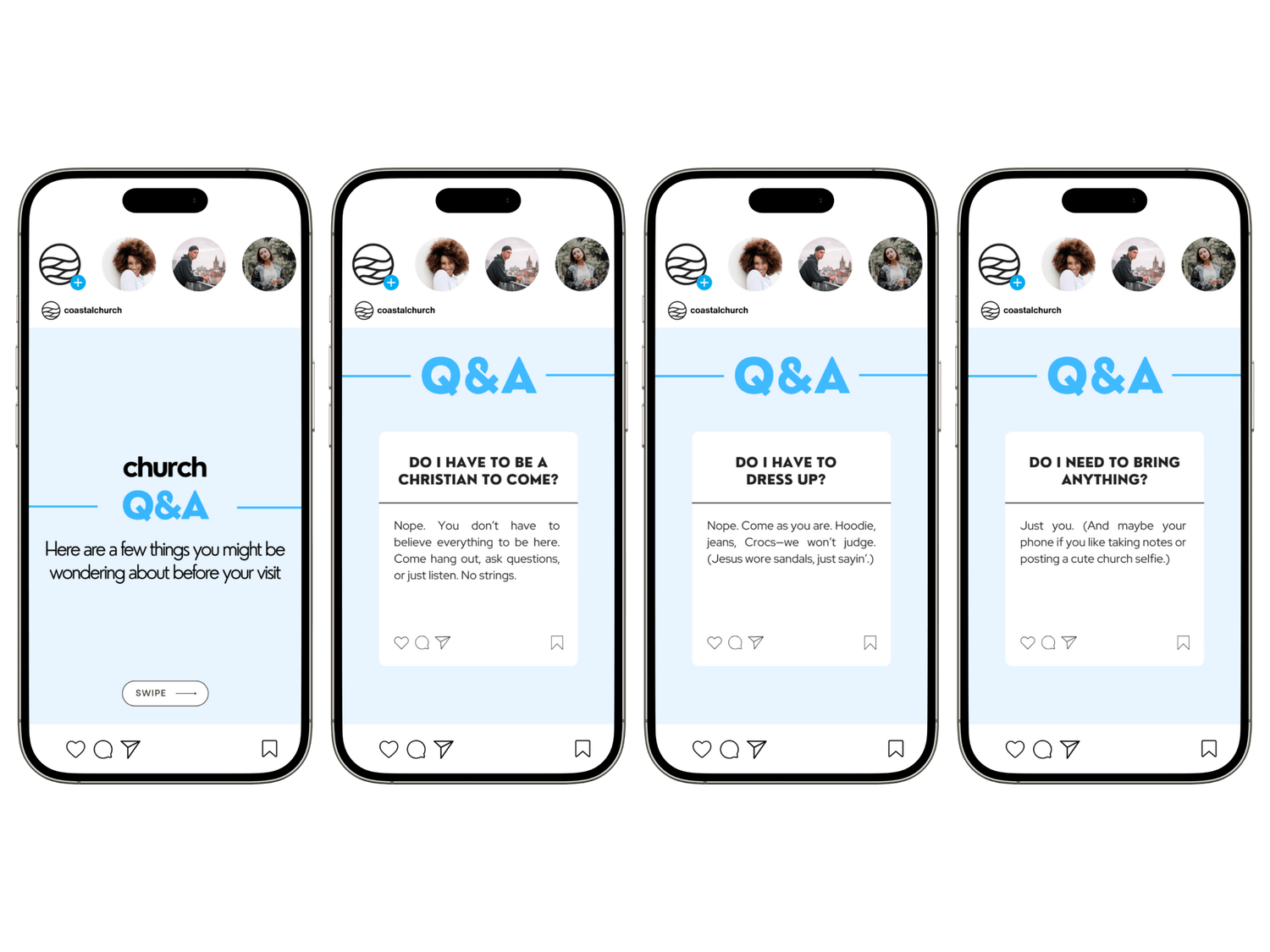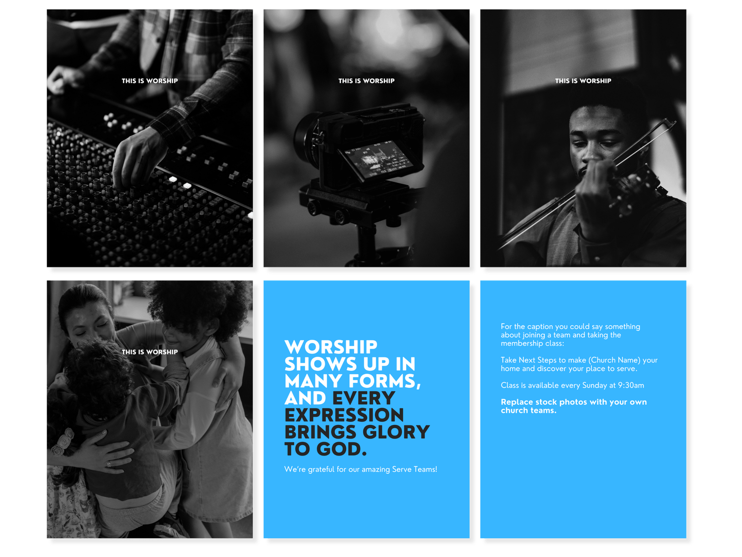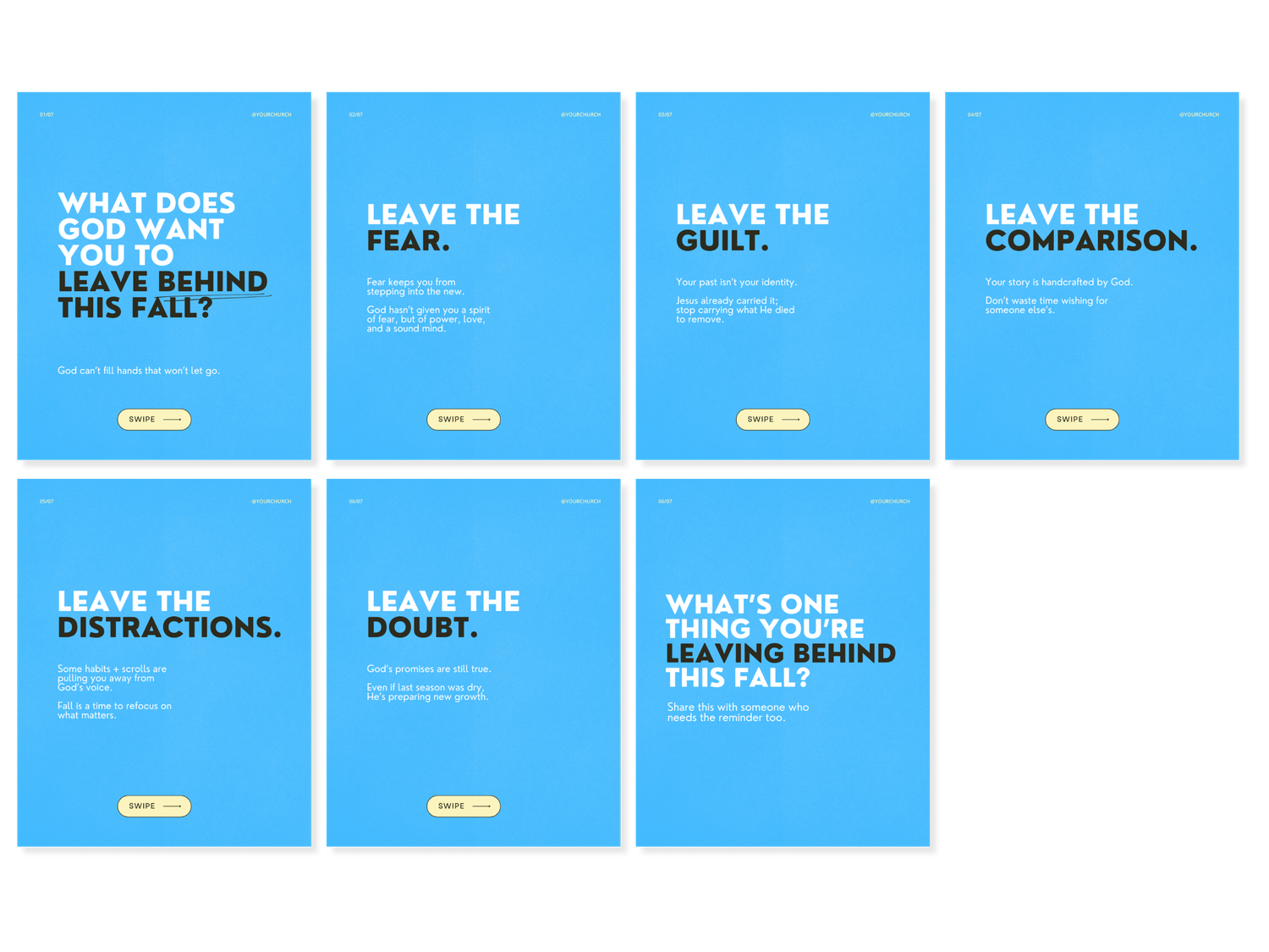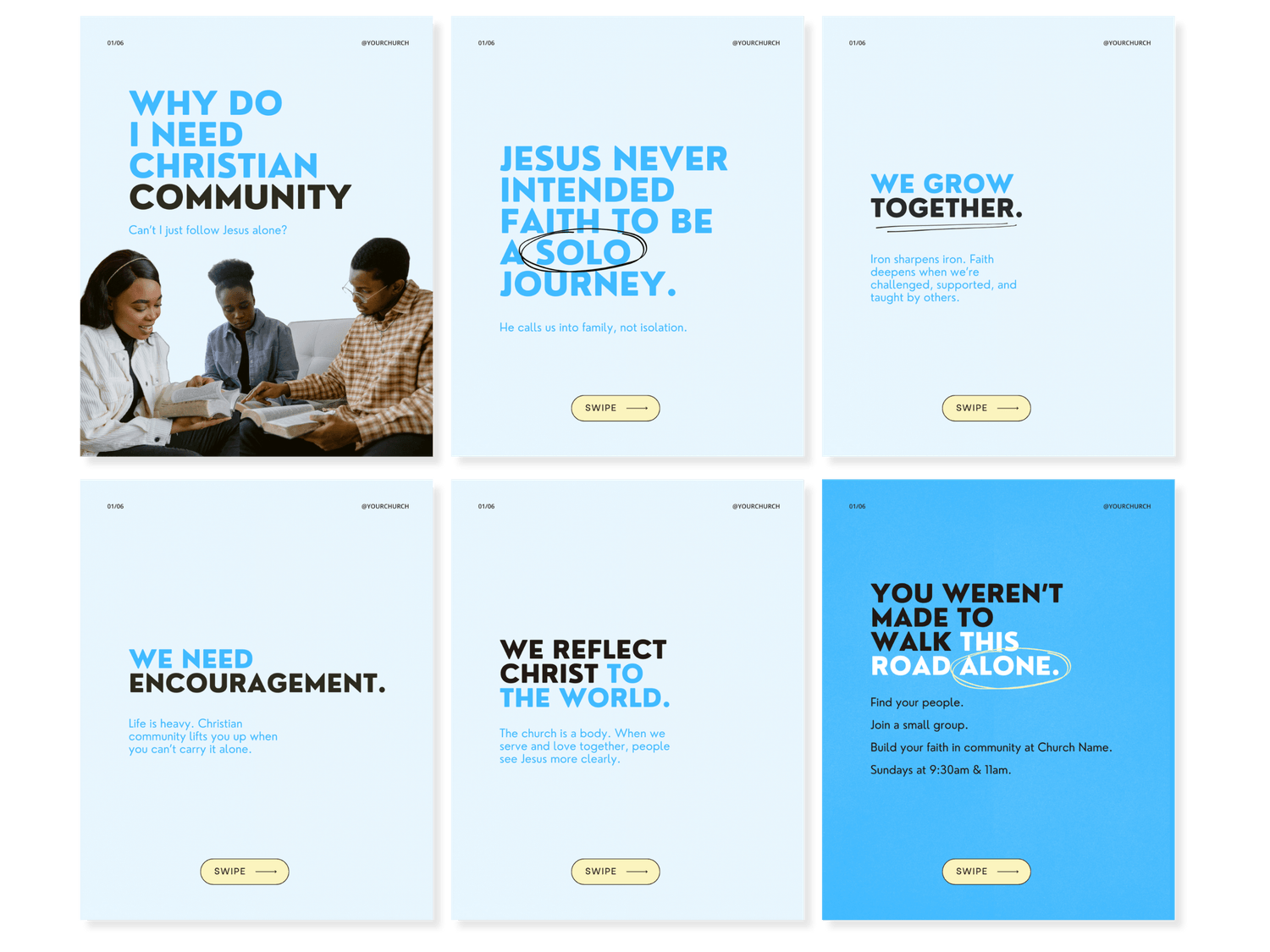 Posts, stories, reel covers, and carousels with prompts you can edit and customize for your church. Carousels count for 1 template even though they have multiple pages.